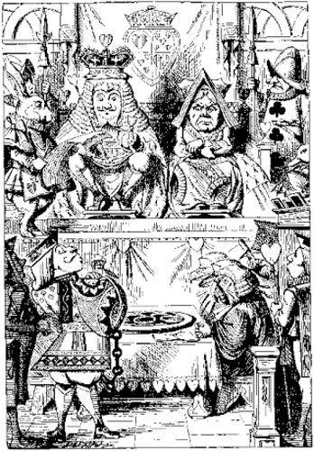 ♥ (61) 第七章。 ハートのキングは白ウサギに、ジャックの告訴状を読み上げるよう命令しました。白ウサギは開廷合図のトランペットを3回吹くとポケットから巻物を取り出して広げ、朗々と歌い出しました。 「♪夏にまるまる1日がかりで ハートのクイーンが作っ…